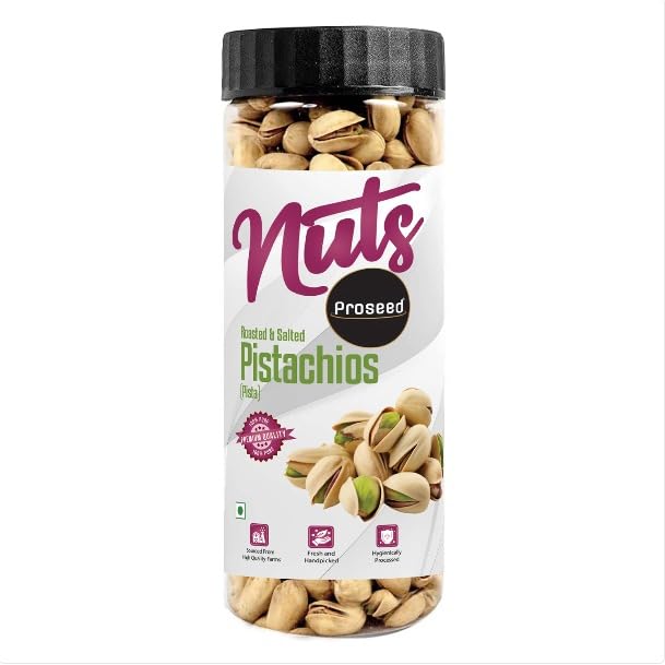 Proseed Naturals 100% Premium Pistachios Proseed Naturals brings you a whole range of premium dry fruits, nuts, and raisins for a wholesome snacking experience. With the choicest selection of nuts, Proseed Naturals 100% Premium Pistachios - Roasted and Salted are worth savouring. Proseed Naturals dry fruits go through up to 10 quality parameters to deliver the choicest selection of nuts. Good choice for your well-being Packed with the goodness of protein, phosphorus, and dietary fibre, Proseed Naturals pistachios are a good choice for your well-being. They are rich in dietary fibre which is generally known to be an essential part of a healthy & balanced diet. Rich in protein and phosphorus, both of which contribute to maintenance of normal bones. So, satiate yourself guilt-free with this fulfilling snack or share it with your loved ones. Happy snacking! Turn your snack time delicious and wholesome with these crunchy and flavourful nuts. They are perfect to curb your hunger in between meals and make for a great addition to your diet. Add these pistachios to your cooking practices and upgrade your favourite dishes to yummy delights.